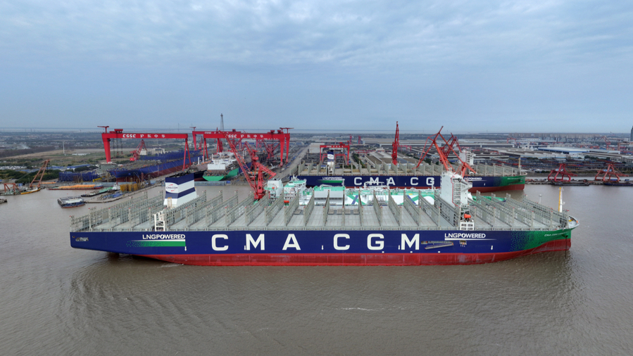 中国船舶集团旗下沪东中华造船(集团)有限公司为法国达飞海运集团建造的全球最大24000TEU 级LNG双燃料集装箱船“达飞旺多姆”号提前8个半月命名交付,标志沪东中华全面完成2025年生产经营任务。这是沪东中华建成交付的第100艘集装箱船,彰显中国在全球造船领域的主导地位。