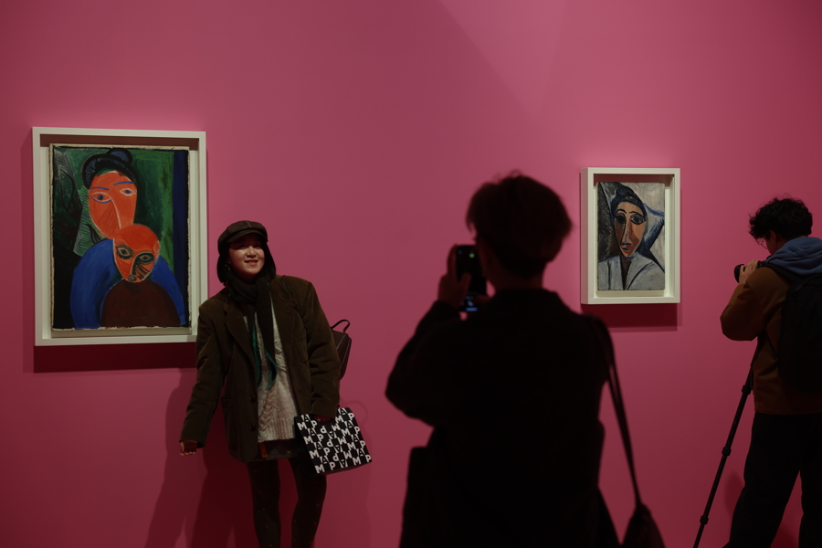 第二个展厅,明丽的粉红色瞬间点亮空间。1906年秋起,毕加索开始新的探索,他尝试简化形体与空间,并聚焦女性身体,多用粉色与赭色,以略显粗犷的手法为女性人物注入一丝中性气质。作品《女人或水手胸像》以正面示人,并采用对称构图,轮廓线条清晰可见。空间层次的简化、形体的紧绷感,为这幅画作增添雕塑般的质感。