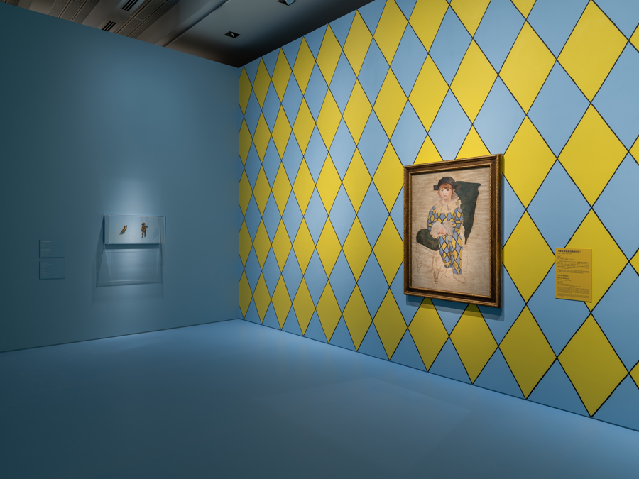 在“童年”展厅,作品本身成为展陈设计的一部分,保罗·史密斯形容,这里是一处“儿童房”。《与玩具卡车玩耍的孩子》面前,展墙铺开大片的深绿,与画中的绿色彼此对话。《装扮成喜剧丑角的保罗》则置身于蓝黄交错的菱形背景之中。