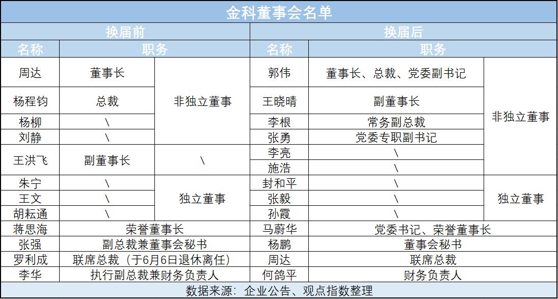 当天晚上,该公司一次性发布了8条公告,大部分都跟董事会有关,当中正式披露了新一届领导班子名单,包括郭伟获任金科股份董事长、总裁、党委副书记,王晓晴任副董事长,周达为联席总裁,李根为常务副总裁,张勇为党委专职副书记,杨鹏为董事会秘书,何鸽平为财务负责人。