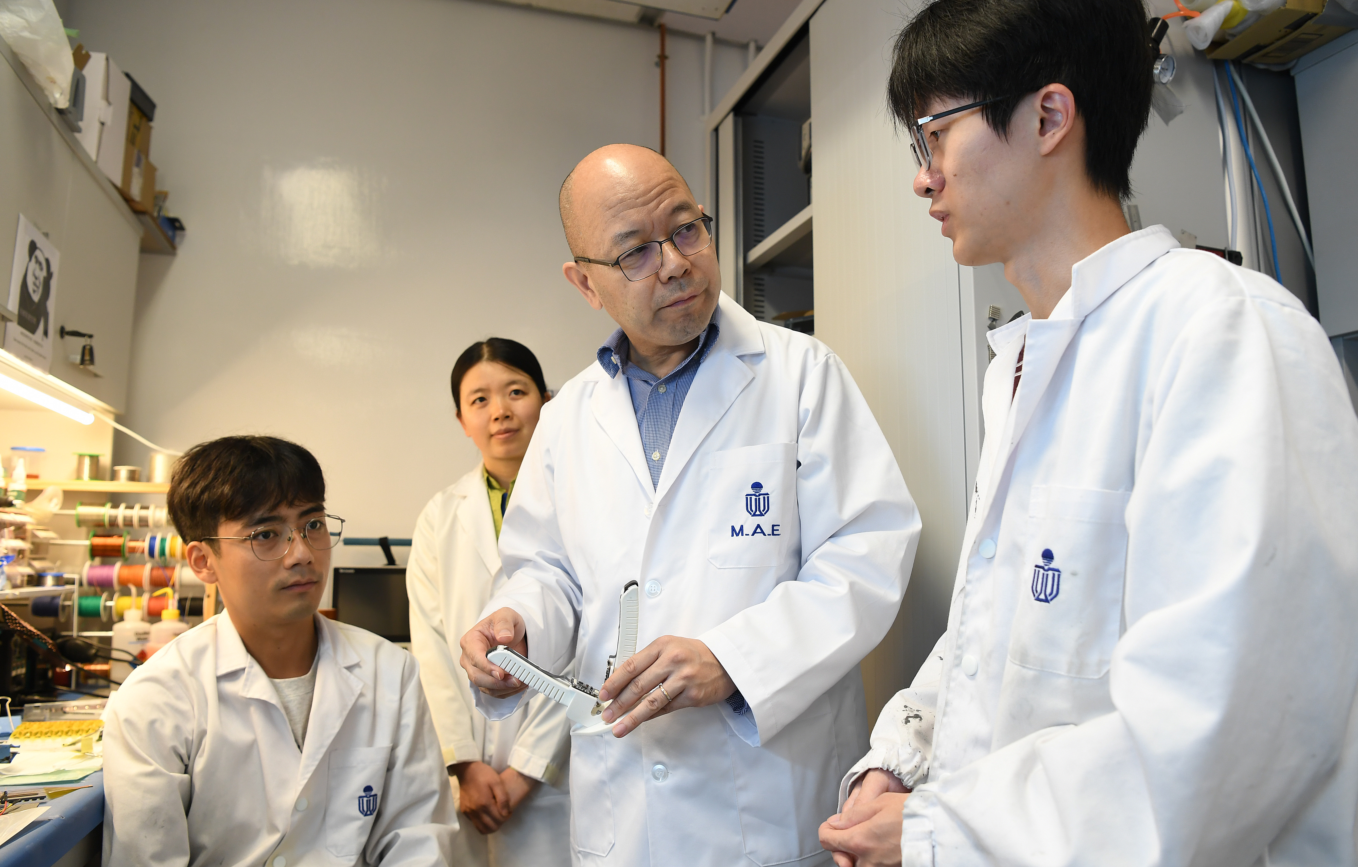 6月19日,香港太空机械人与能源中心联合主任于宏宇教授(右二)在实验室与团队成员交流。新华社记者 陈铎 摄